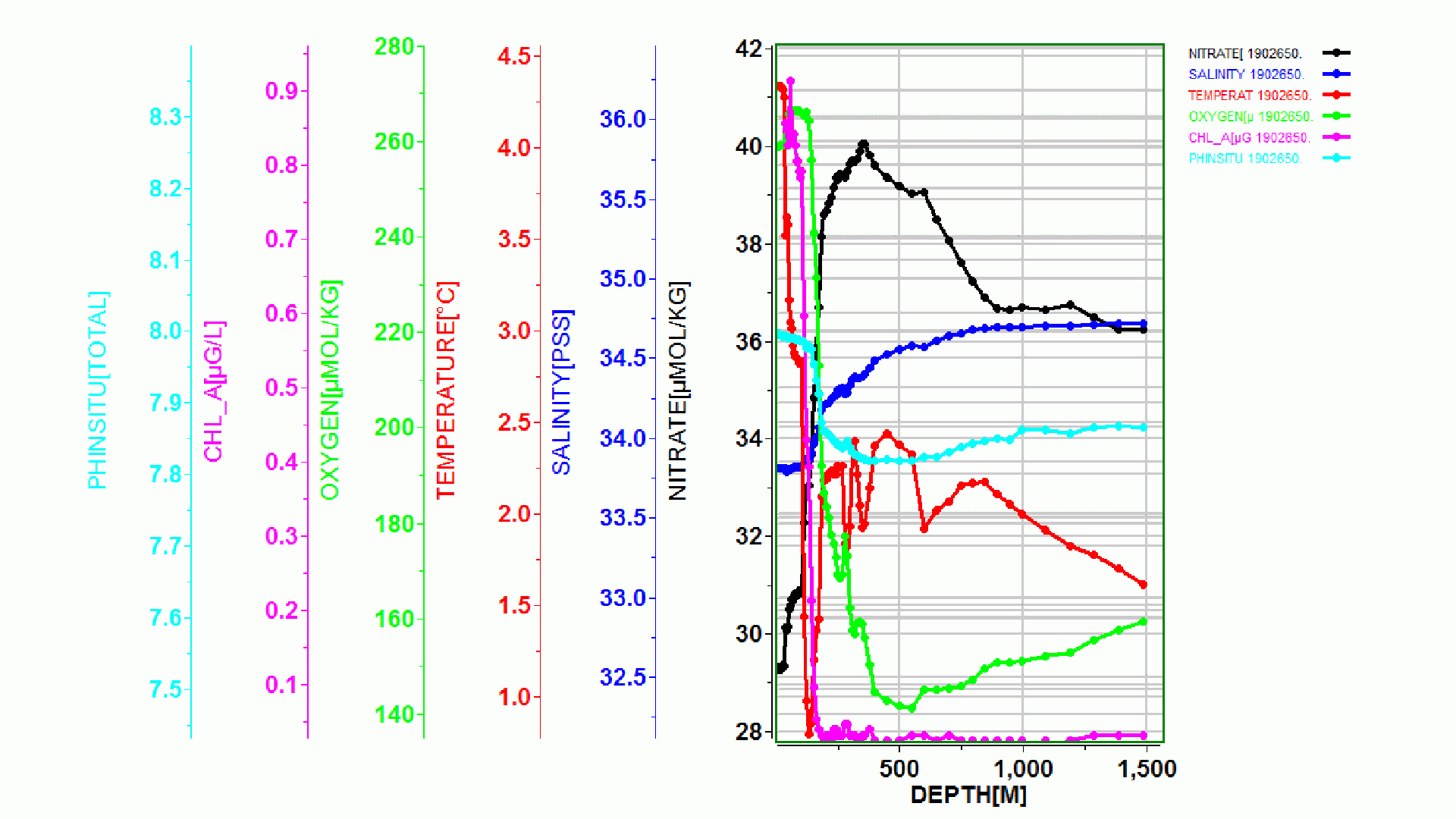 Trieste wasted no time in beginning its mission! We have already received the first profile from the float. All float data are freely available to the public and can be accessed on the GO-BGC or SOCCOM websites. Data for all adopted floats can be explored on the MBARI AdoptAFloatViz website. Plots like the one below can be used in a variety of ways to get students familiar with reading graphs. Questions can focus on basic understanding (What parameters are being measured? What are the units of each parameter? What are the minimum and maximum values of each parameter?) or can encourage students to interpret the information presented (What is the depth of the Chlorophyll maximum? What is the difference in salinity between the surface and deep waters? How would you describe the temperature through the water column?). There is more information available on the “For Educators” page on the Adopt-a-Float website, including background information on floats, how to access data, and featured lesson plans and activities.
