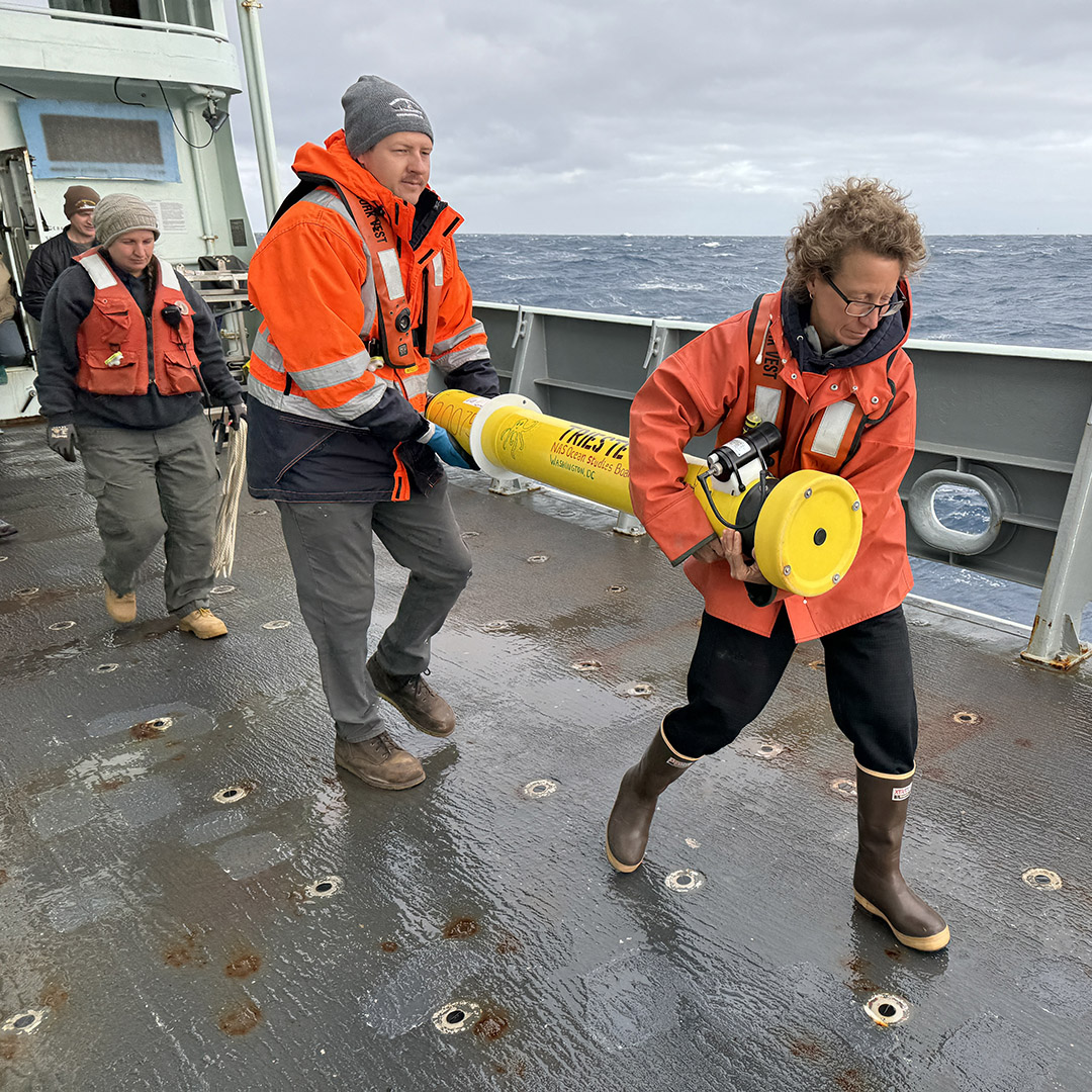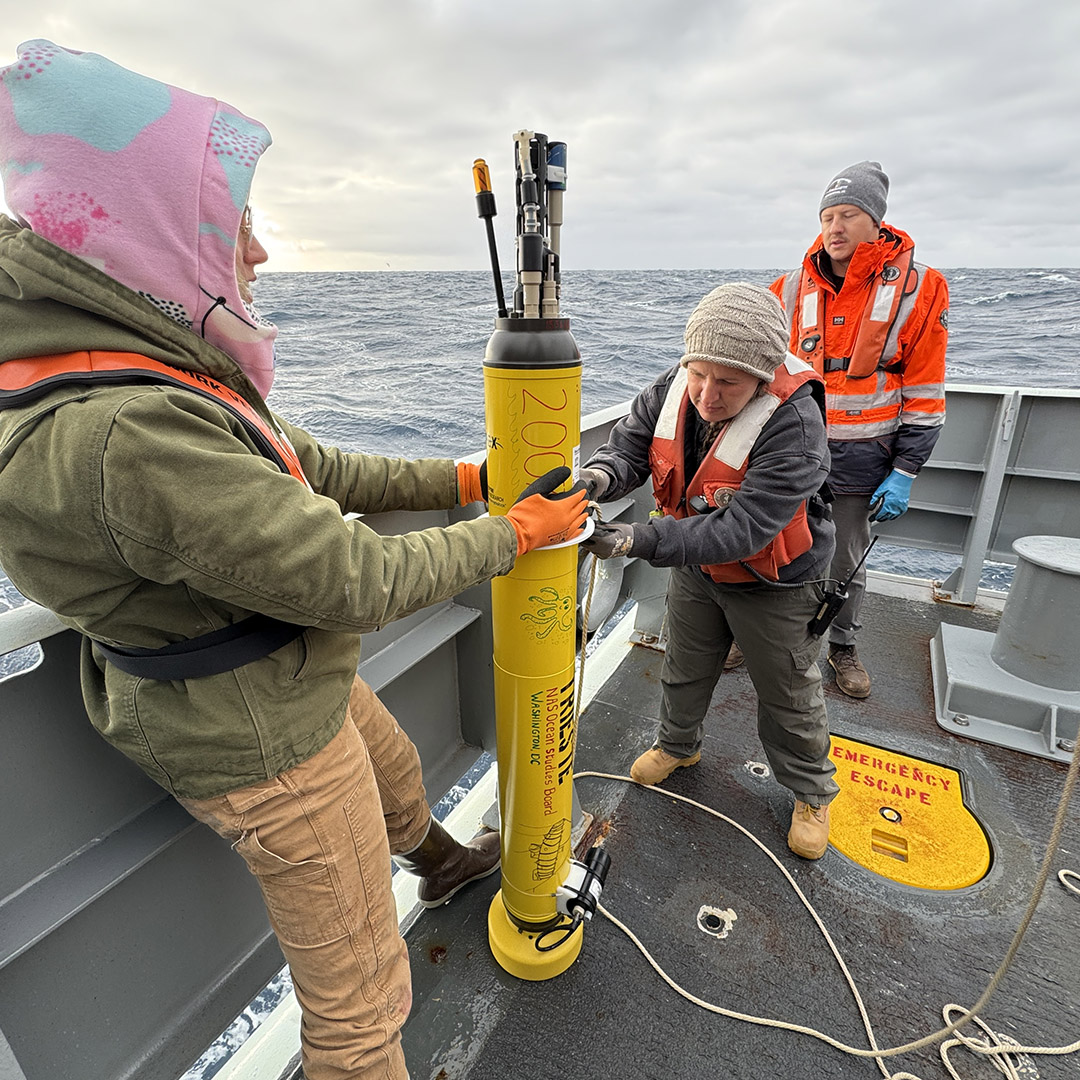 While it was the first BGC float deployment on I08S, it was by no means this crew’s first deployment, and everything went very smoothly. The float was carried out to the stern deck, where it was deployed by hand. First, a line was attached to the deployment disk on the float, which was then carefully lowered over the side into the water. When it was safely floating freely, the line was recovered and the float drifted slowly away.