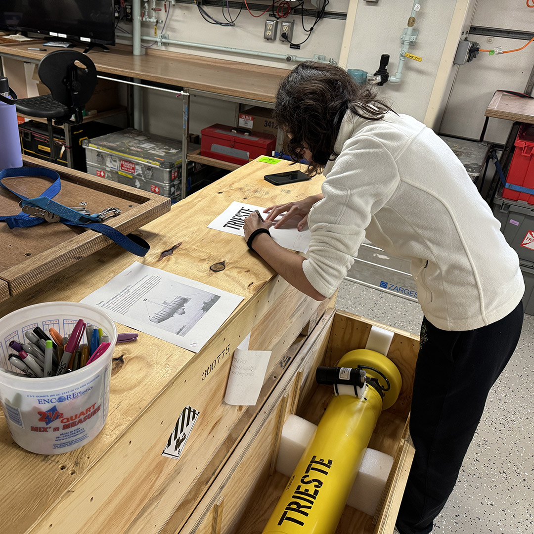 Trieste was one of the first floats to be decorated on I08S and CTD watchstander Maria Sanchez Urrea did not disappoint! She carefully planned out the design using photos of the Trieste bathyscaphe. It’s much harder than it looks to recreate a photo design in Sharpie on a curved surface while the ship is rockin’ and rollin’, but Maria did a wonderful job! Scientist Cora Mckean even added a cute little octopus to keep the sub company on its descent.
