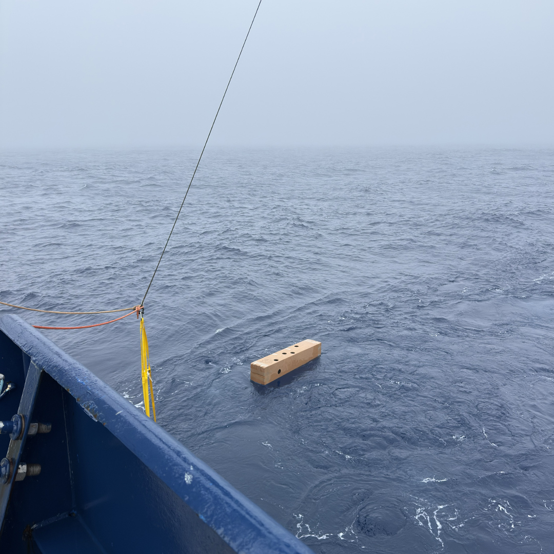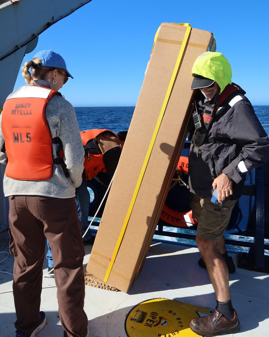 There are a few methods by which floats are deployed, and we have used all of them on these first seven floats. Two of the methods involve floats that are in a dissolvable cardboard enclosure (“boxed”), with the last requiring no additional housing around the float. Boxed floats are most commonly deployed by carefully lowering them over the side of the research vessel and releasing them into the ocean upon contact with water. An alternative method, in case the water-release mechanism fails, is to set up two lines that wrap around the box, which are then slowly unraveled as the float is lowered down the side of the ship.