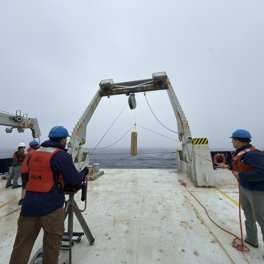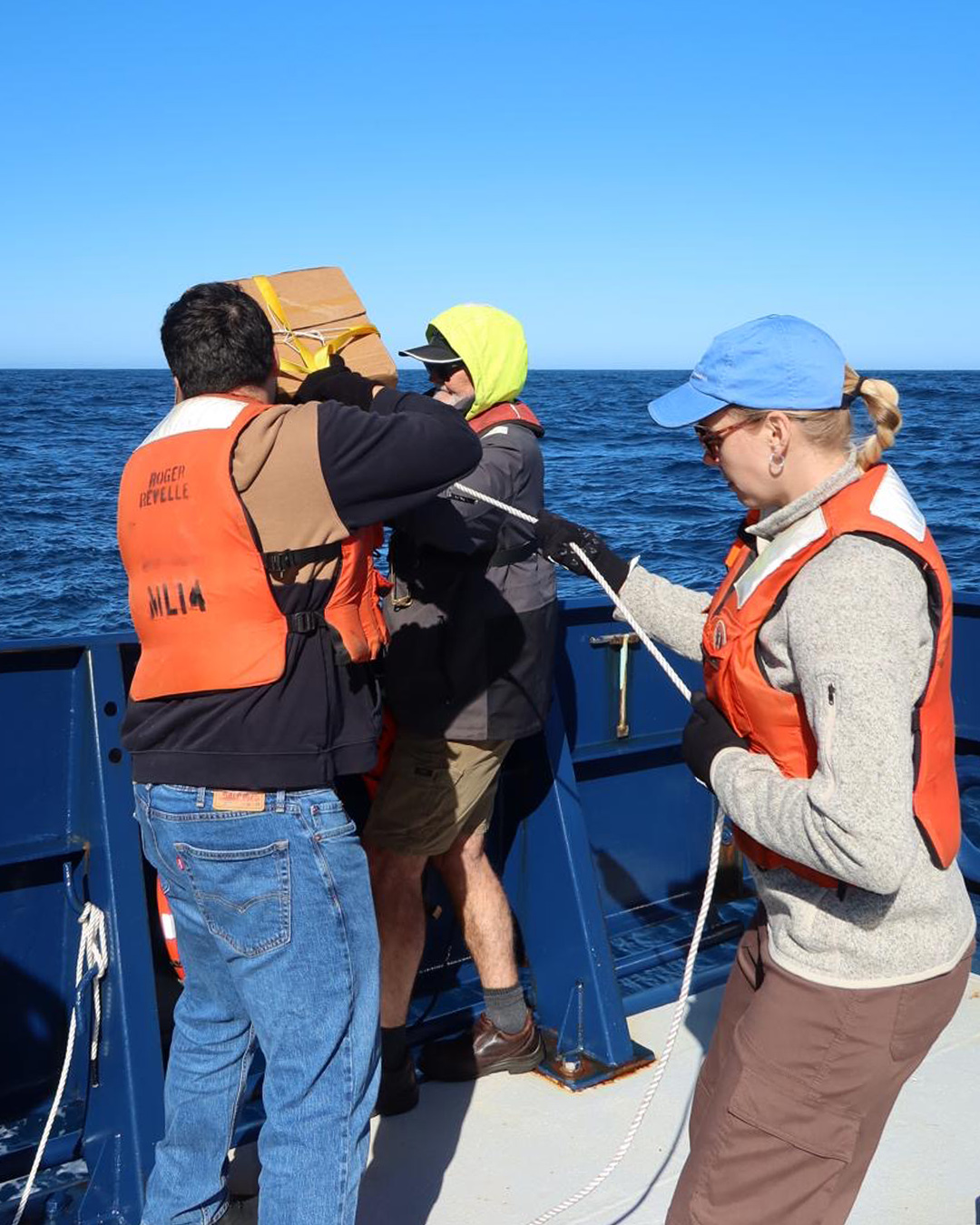 Zack Nachod, Reese Barrett, and Doug Penny lifting a boxed core float over the side of the ship; Photo credit: Reese Barrett