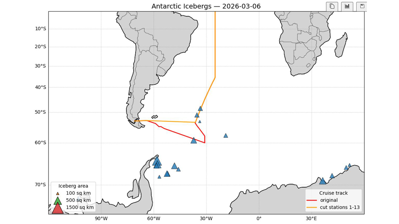 The R/V Revelle is a very capable ship, but it is not an icebreaker. Fortunately, sea water has a very high heat capacity, which means the yearly advance of the Antarctic sea ice edge will proceed slowly enough to not come near our sampling stations. The same cannot be said, however, for icebergs. These floating chunks of the Antarctic ice sheet can survive adrift for many summers before melting. The longest lasting Antarctic icebergs follow ocean currents like the clockwise Weddell gyre circulation, which steer them onto a northward path known as “iceberg alley”, aimed straight at both our original and revised sampling lines! Our skilled crew knows how to navigate around these obstacles safely, provided we travel slowly. Thus, by spending less time in iceberg alley, we ensure we have enough time to complete all of our sampling stations before the end of the cruise.