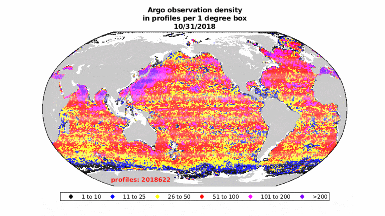 Seasonal change has been a central consideration for the science team as we adapt our plans to accommodate the delayed cruise start. Discussions have often centered on our sampling strategy in the remote Southern Ocean, between 60˚S and 50˚S latitudes. Data we collect in the Southern Ocean is especially valuable, as the region’s dynamics have an outsized influence on the global climate system — a topic I study in my lab back home. Yet, despite this importance, it remains one of the mostly poorly sampled areas among the global oceans, as can be seen in the map below (black and blue colors).