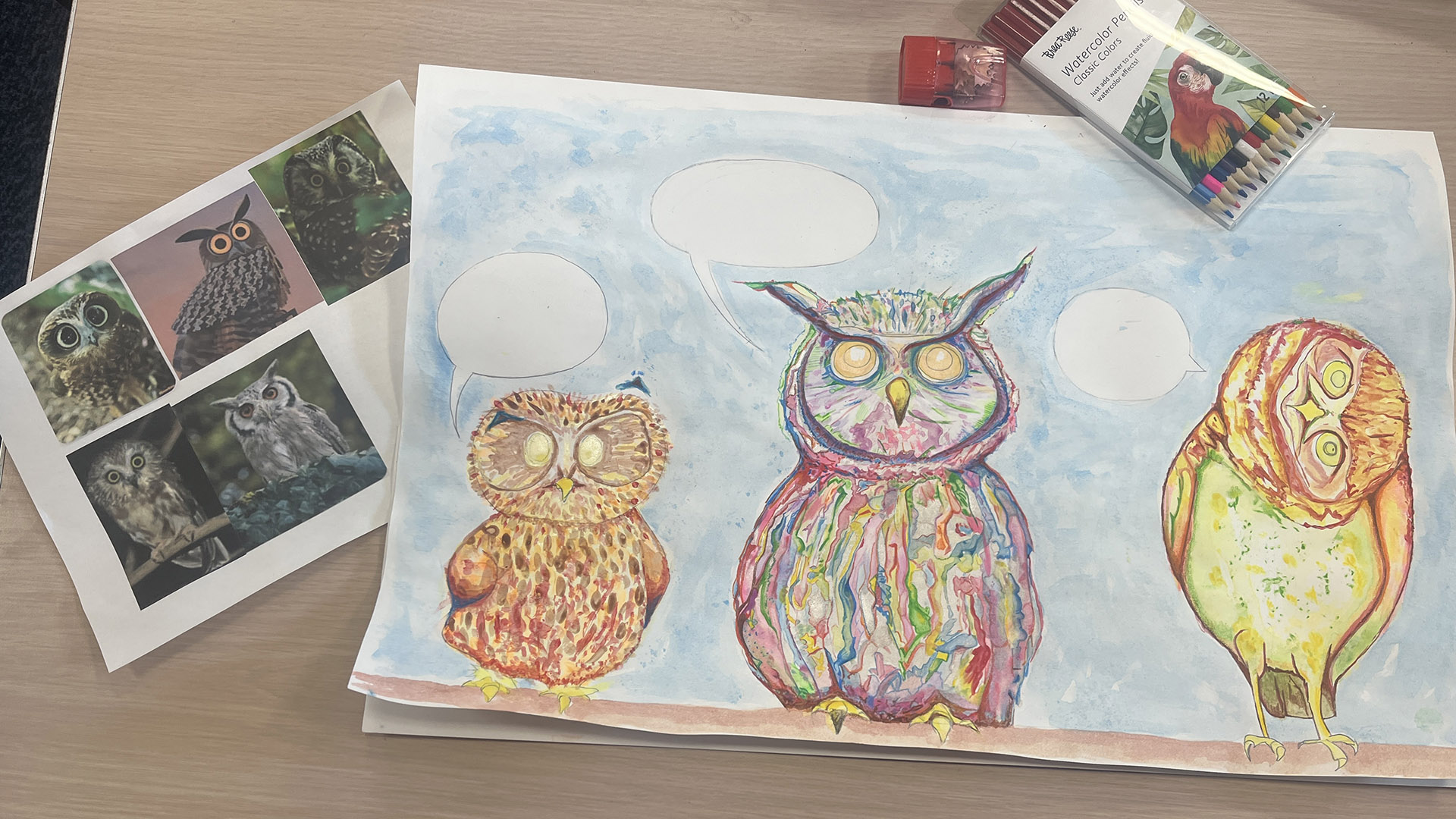 And that’s not the only other owl onboard. In his downtime, second mate Kenny Beaver is working on a gorgeous drawing of three inquisitive owls. I’ve enjoyed watching him work on it each evening; his use of color brightens more than just the page. I’m hoping I get to find out what each owl is saying before I have to leave the ship, which is in only a few days.