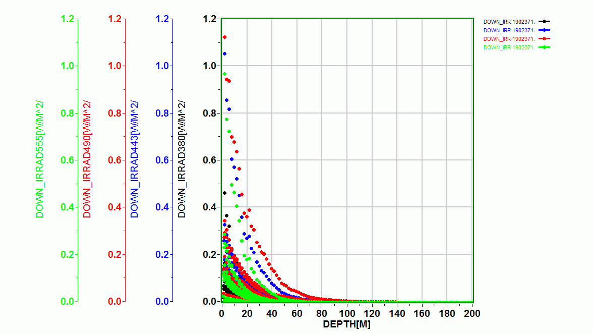 The GO-BGC team is excited about these new SOLO floats and it’s great to have a couple in the water. They have six sensors on them, including a multispectral radiometer that measures how certain wavelengths of light (380, 435, 490 and 555nm) travel through the water. As you can see from the plot, this value drops off to essentially zero after about 50 or 100 meters. Deeper than that, only higher wavelength red light is visible. These optical measurements can give us a better estimate of phytoplankton concentrations. The SOLO floats I’ve deployed join only a handful among the hundreds that make up GO-BGC and SOCCOM with this sensor.