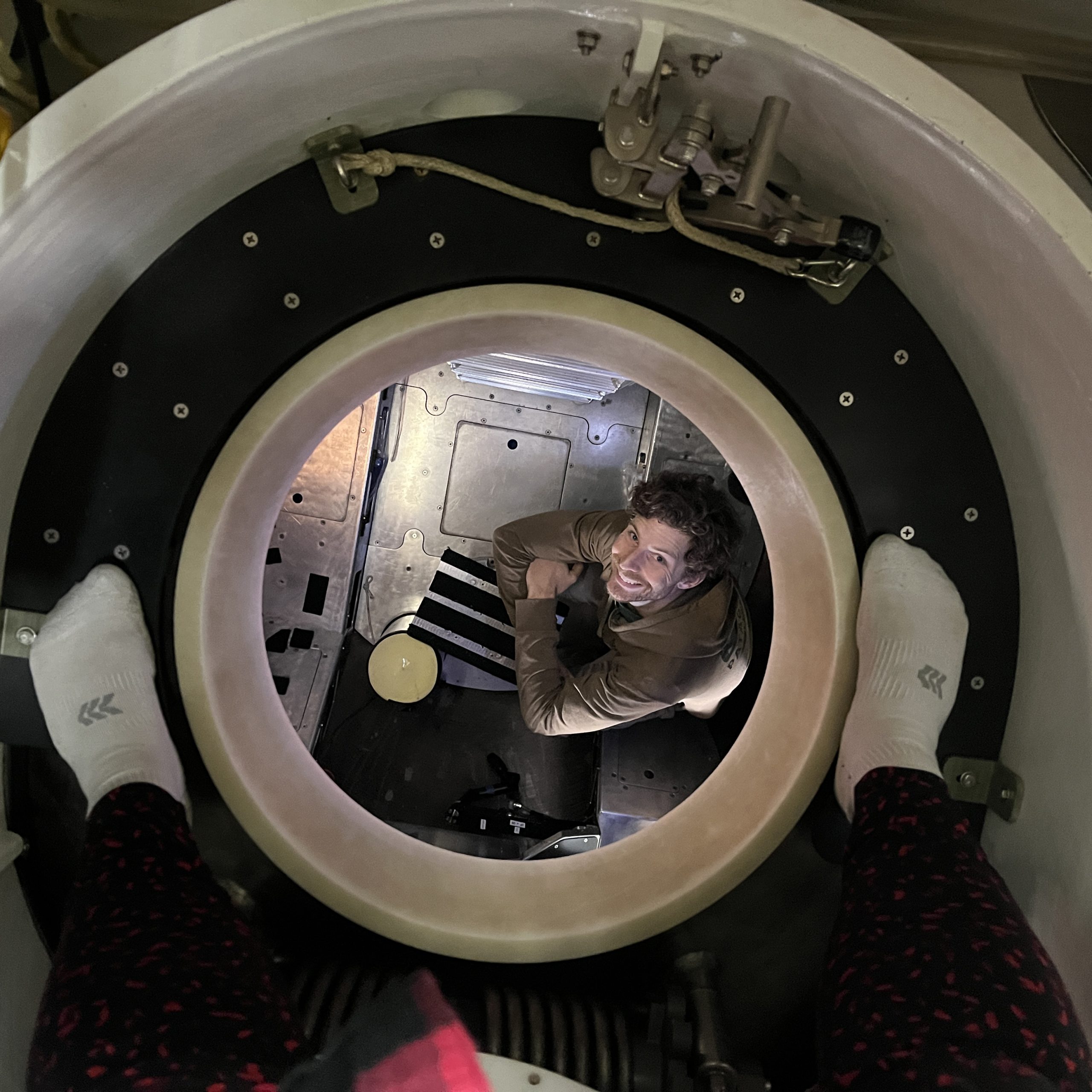 Matt, one of the engineers was nice enough to give me a tour of Alvin, inside and out, and answer my many, many questions. Does it sit on the bottom or hover just above the seafloor? Where do you store all the science samples? How long does it take to train a pilot? What if you need to pee? He had answers for all of them, which we’ll get to.