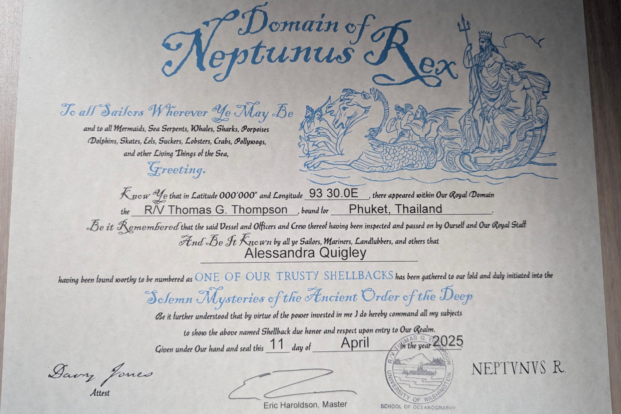 After the ceremony, we all got gorgeous certificates signed by the captain and Neptunus Rex himself, so now I have some artwork for my apartment. And I suspect a lot of us will be getting turtle tattoos when we reach Thailand. I’m grateful for all these games and traditions, as they really do make 41 days at sea go by much faster. It’s never boring on the R/V Tommy Thompson!