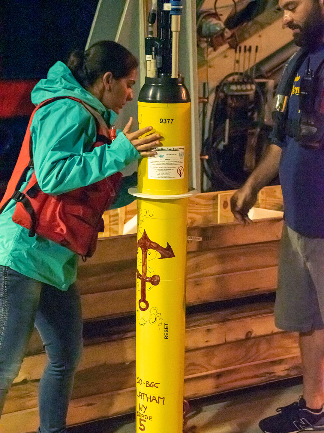 After cleaning the optical nitrate and bio-optical sensors, CTD watchstander Mariana Aguirre Nunes (left) and Res-Tech Josh Manger (right) getting ready to deploy Anchored in STEAM@nccs. Photo Credit: Nick Benz