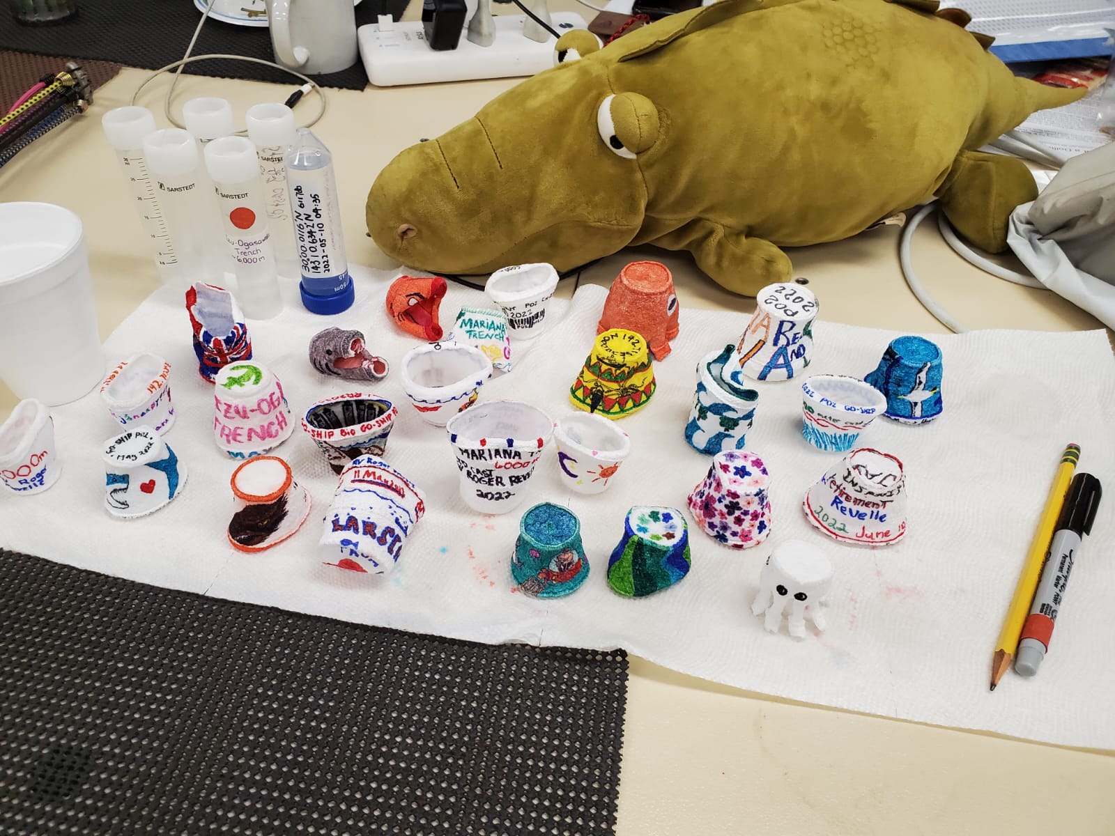 Today’s blog post features Bill the crocodile and the day he spent with his human, Co-Chief Scientist Shuwen Tan, and her minion’s, CTD-Watch standers Vic and Mariana. (Note, CTD is just the shortened name for one of our instruments that measures Conductivity, Temperature, and Depth). The day’s adventures were especially fun, not only because of the reptilian companionship, but also because we visited the Izu Ogasawara Trench off the coast of Japan. The trench is nearly 10,000 meters at its deepest point, but our sampling only went to 6,000 meters (which is still nearly 4 miles deep!!). To celebrate, scientists sent down styrofoam cups which shrank from the pressure of those 6,000 meters of water they were under.