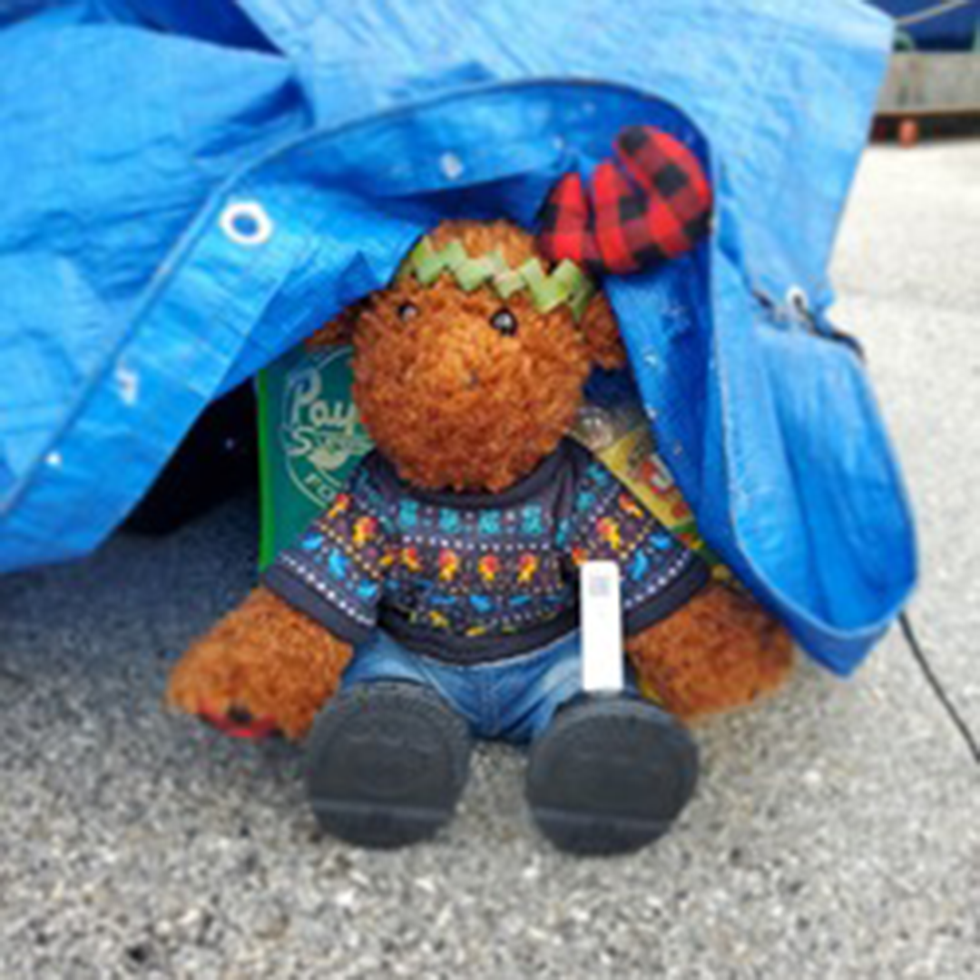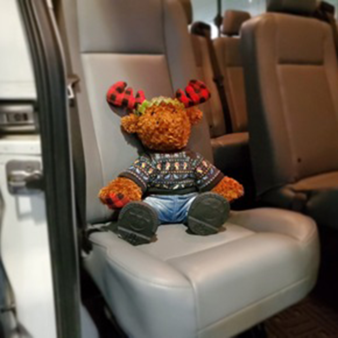 It is moving day on the R/V Roger Revelle, our scientists (and their fuzzy friends) are being roused from their isolating quarantines and heading to the ship with their fellow crew members. Today’s blog post features one of the scientific crew member’s stuffed companion, Mr. Duke Moosington the II, in the process of boarding the ship. Bright and early at 6 a.m. the crew were picked up from their hotel and shuttled over to the naval base where the R/V Roger Revelle is docked. Duke Moosington found the seat belts to be oversized, but otherwise found the vans to be quite comfortable.
