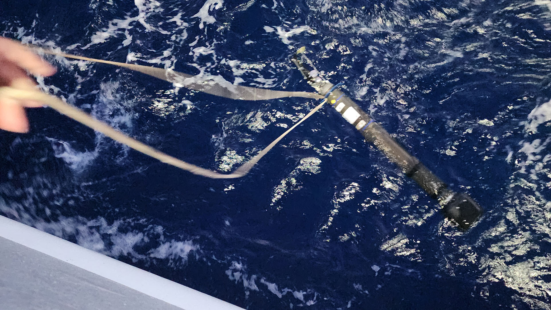Our BGC floats are shipped in sturdy wooden crates. To deploy them, we lift them out of their boxes and carefully lower them on a rope over the side of the ship. All of our BGC floats on this trip have been adopted and named by school groups.
