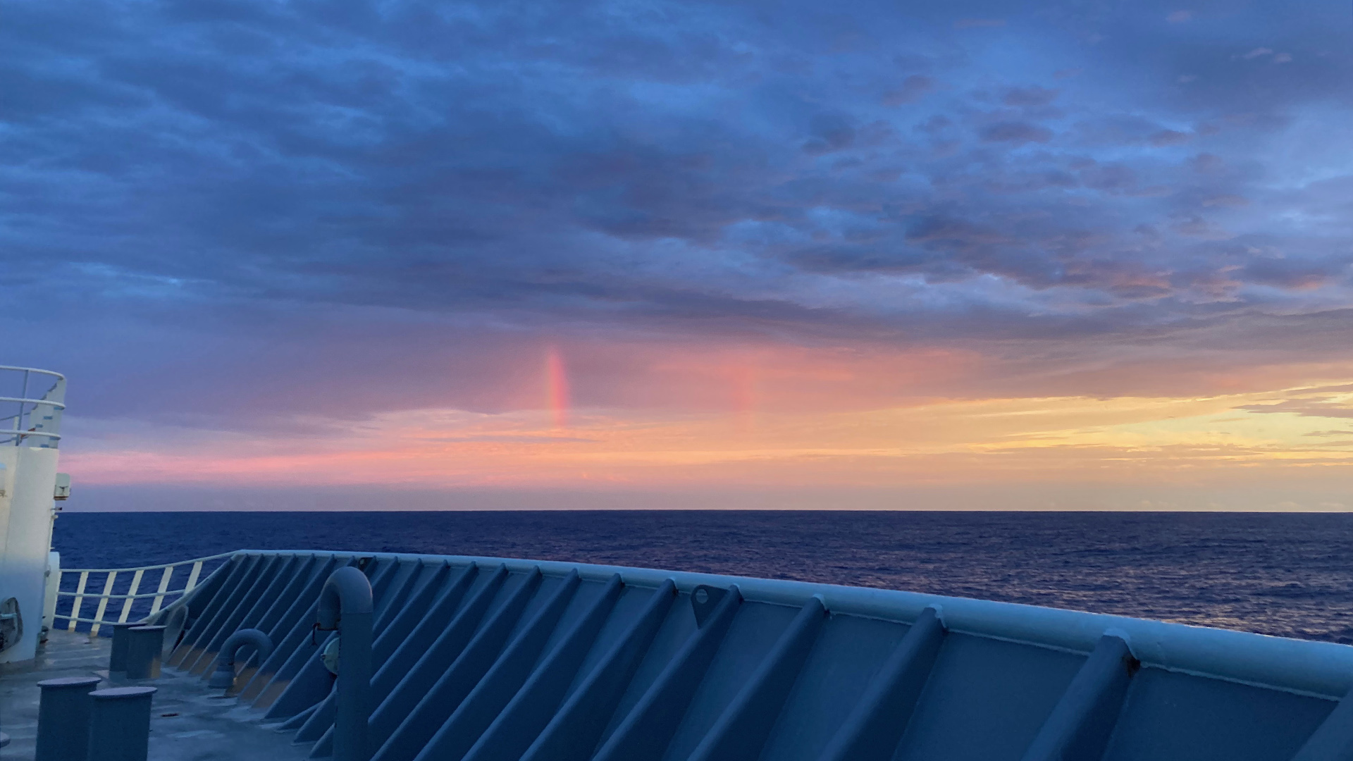 I’ve been luxuriously enjoying a little reading time on the bow of the ship every evening once the sun gets low. Sunset over the water is pretty spectacular, and I feel extremely lucky to be able to soak in the bright orange and pink colors, the variety of shapes and textures of the clouds, and the sight of rain over the ocean in the distance. Sometimes a vertical slice of rainbow will appear under one of the soft gray clouds.