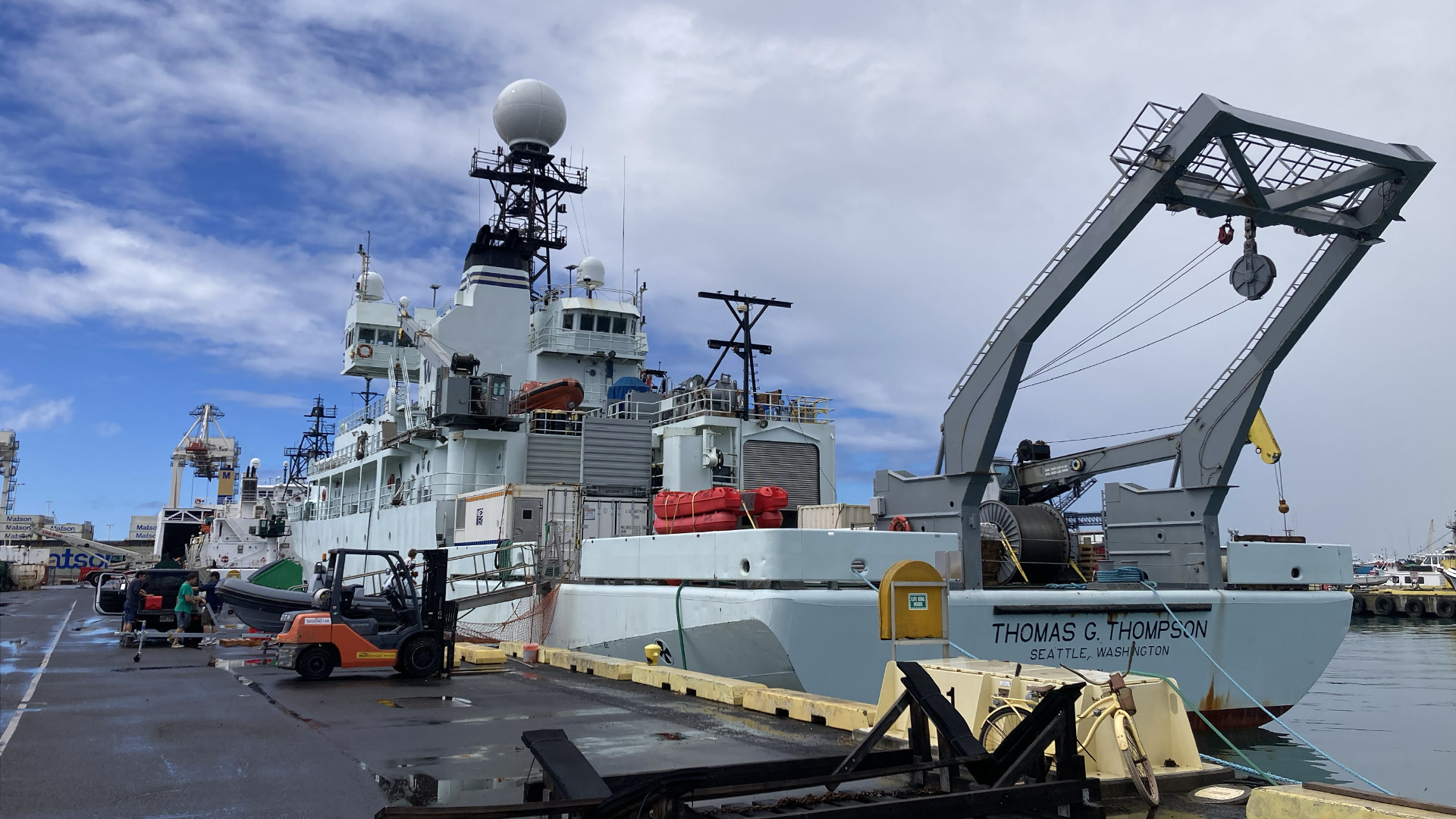 On Saturday, I took an 11-hour nonstop flight from Boston to Honolulu and headed straight to the ship, which was docked at the University of Hawaiʻi pier. The deck of the ship was bustling with crew members busy loading equipment and supplies. Extremely jet lagged, I dropped my luggage off in my room (with no other science party on board, I get a room to myself!), found some lunch nearby, then proceeded to take a “nap” that ended up being about four hours long.