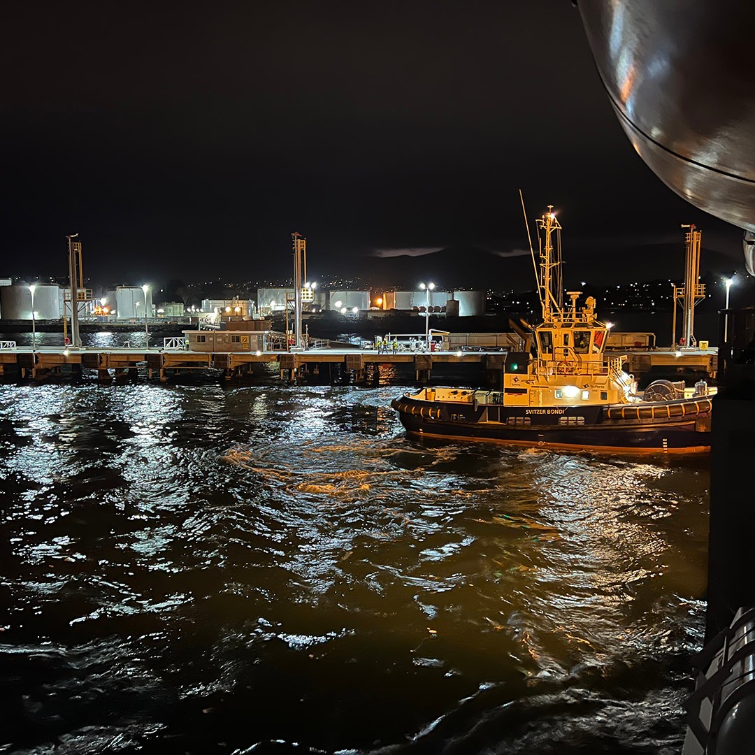 The tugboat Svitzer Bondi pushed us around as we departed the fuel station. Photo by Jenn Magnusson.