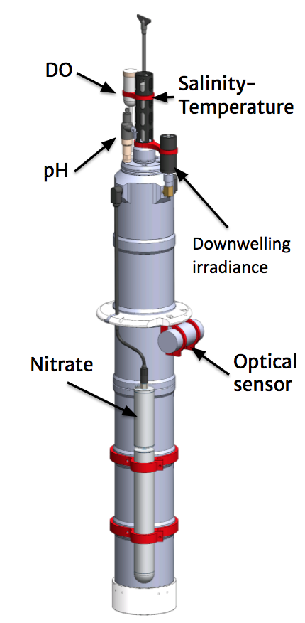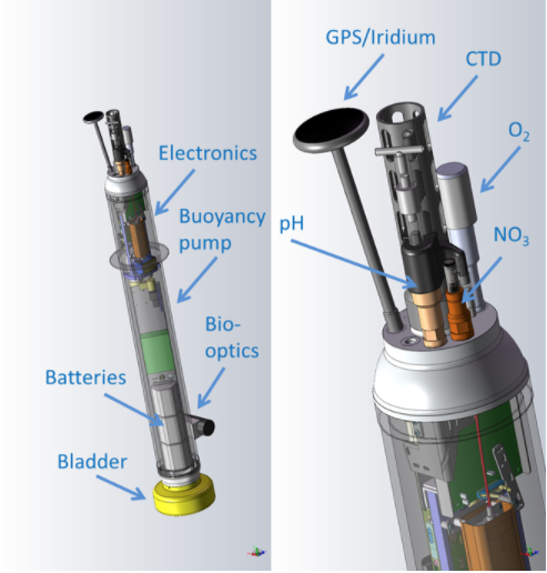 The floats are equipped with a suite of sensors that gather information about the ocean. They measure several biogeochemical parameters, the data from which will help researchers monitor the health of the ocean. The sensors include: