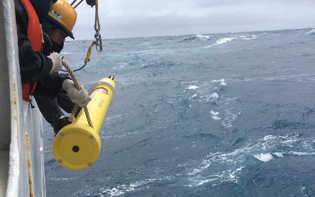 Ocean-going monitoring floats like this one are deployed from “ships of opportunity” as they transit the ocean. Image courtesy of SOCCOM (NSF Award PLR-1425989)
