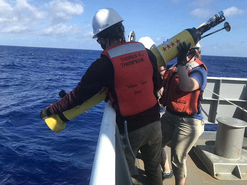 Researchers aboard the RV Thomas G. Thompson preparing to deploy a Global Ocean Biogeochemistry (GO-BGC) float. Photo Credit: Andreas Thurnerr