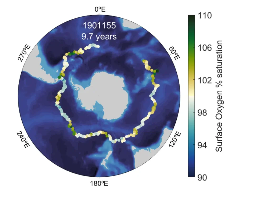 Path of the float #1901155. Each circle represents one sample time, and colors represent the surface oxygen saturation at the time of collection. Credit: Josh Plant